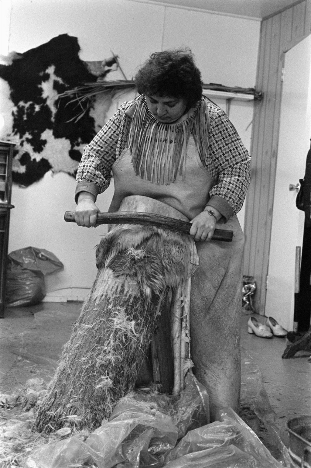 - Activités artisanales des métis et indiens sans statut : grattage d'une peau de caribou, séparation de lisses de frêne, polissage de frêne