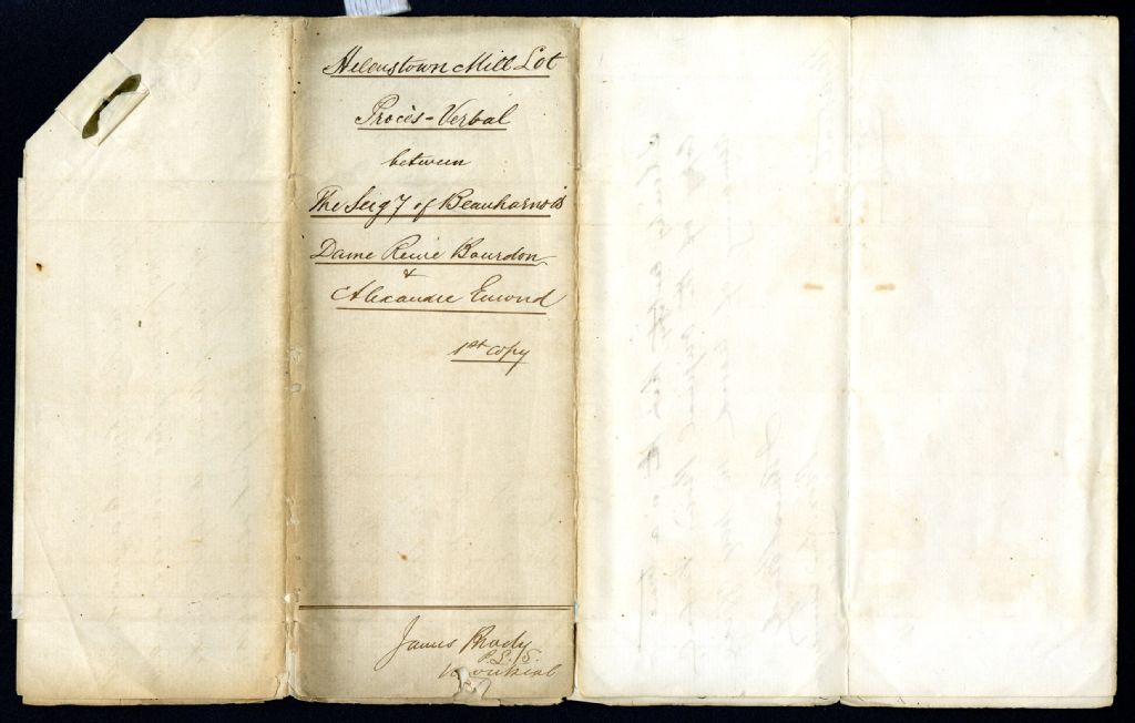 - Le document textuel est copie authentifiée par James Brady le 14 avril 1866. Il porte le titre "Helenstown Mill Lot, Procès-Verbal between The Seigniory of Beauharnois, Dame Reine Bourdon & Alexandre Emond". Outre les personnes mentionnées dans le titre, James Brady, F.X. Poitras, James Keith, L. Gervais et J.B. Meloche ont également signé le procès-verbal.Le plan, daté de septembre 1865, porte le titre "Plan of Helenstown, Grist-Mill Property (attached to Procès-Verbal)". Il situe les terres et le moulin à farine appartenant à Dame Reine Bourdon aux abords du fleuve Saint-Laurent. Il indique également l'emplacement des lots 25, 26 et 27, ainsi que les propriétés de la Seigneurie et celle d'Alexandre Emond.