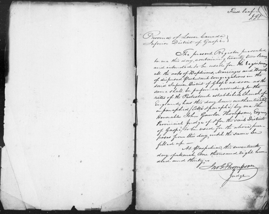 Protestant Episcopal of St-Paul & St-James of Gaspe Bassin, 1829-1906; 1908-1921, Archives nationales à Rimouski, Fonds Cour supérieure. District judiciaire de Gaspé. État civil, (01R,CE102,S37).