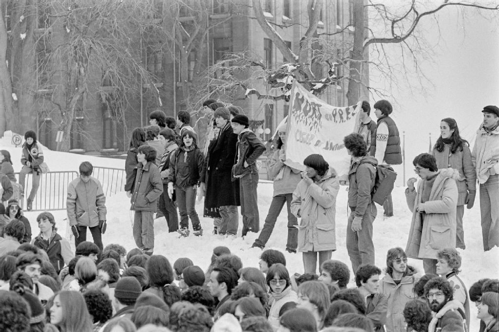 Visite de Alain Marcoux, Ministre des Travaux Publics, à son ministère et manifestation étudiante devant le Parlement, 1982-03, Archives nationales à Québec, Fonds Ministère des Communications, (03Q,E10,S44,SS1,D82-156), Marc Lajoie.
