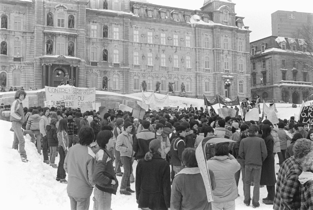 Manifestation étudiante devant le Parlement, 1982-03, Archives nationales à Québec, Fonds Ministère des Communications, (03Q,E10,S44,SS1,D82-225), Marc Lajoie.