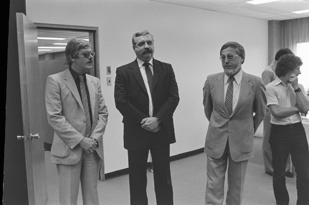 Le Ministre des Affaires Sociales Denis Lazure visite la Régie des rentes, 1982-06-17, Archives nationales à Québec, Fonds Ministère des Communications, (03Q,E10,S44,SS1,D82-374), Bernard Vallée.