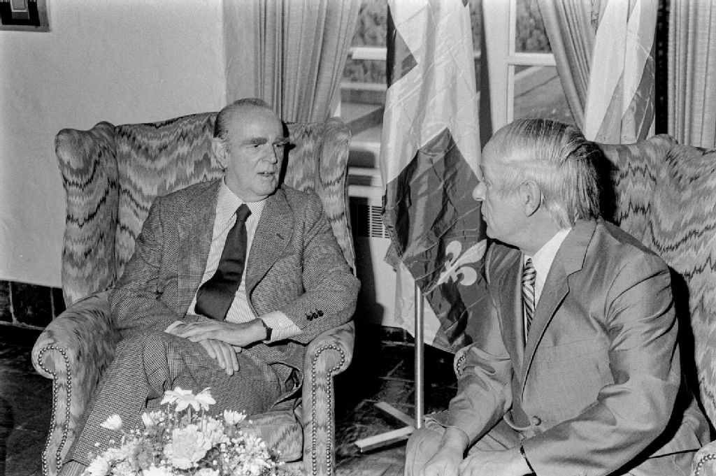 Visite du Ministre de la Grèce, M. Caramenlis, et de René Lévesque, 1982-10-16, Archives nationales à Québec, Fonds Ministère des Communications, (03Q,E10,S44,SS1,D82-645), Henri Rémillard.