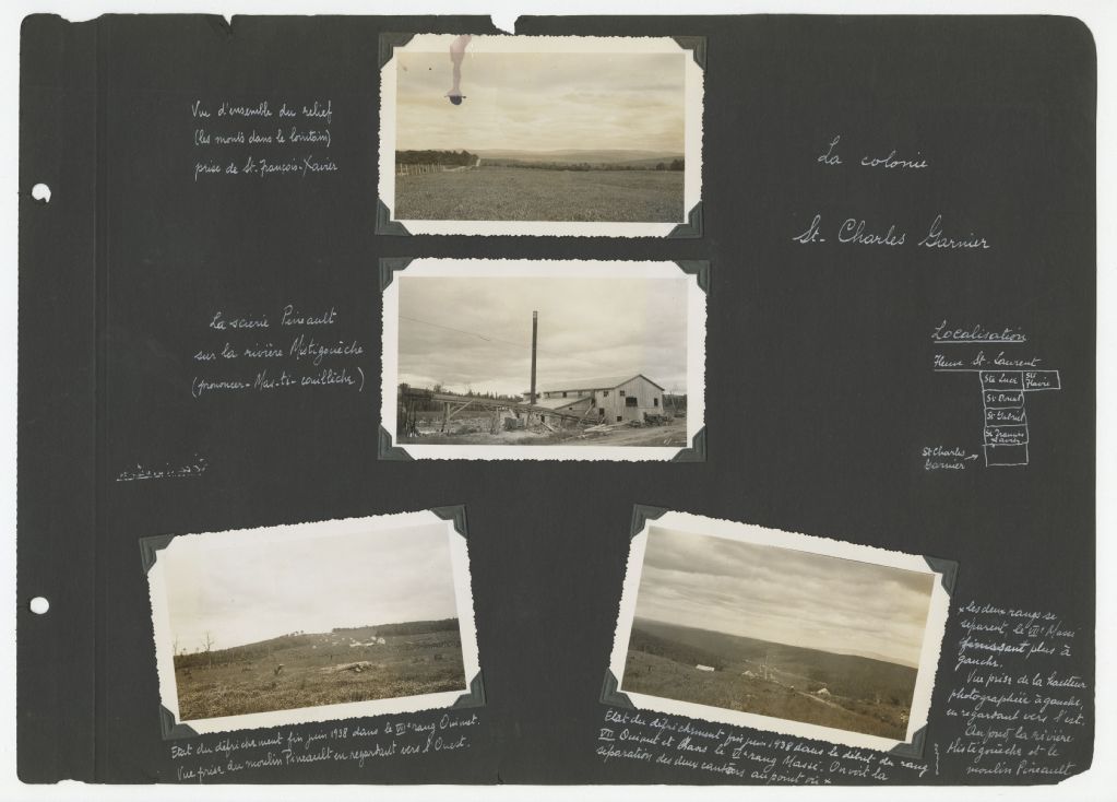 Nous retrouvons dans cette page d'album des images du relief dans la colonie Saint-Charles-Garnier, de la scierie Pineault sur la rivière Mistigouèche et du défrichage dans le 7e rang Ouimet (VIIe rang).