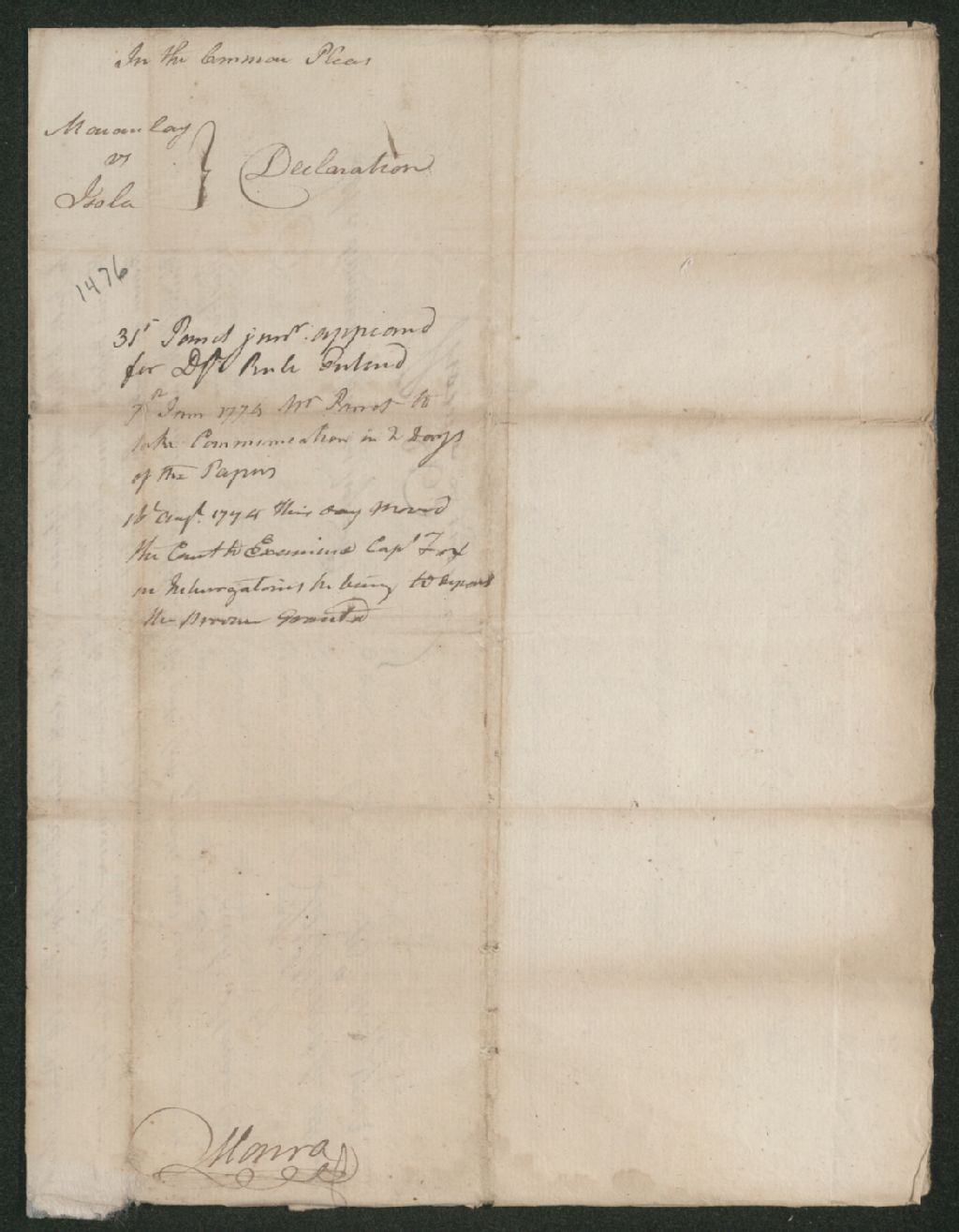 Procès entre Zachary Maccaulay (Macaulay), marchand de Québec, d'une part, et George Isola, navigateur de Québec, d'autre part, à propos d'une dette impayée, 5 novembre 1773 au 18 avril 1775, Archives nationales à Québec, Fonds Cour des plaidoyers communs du district de Québec, (03Q,TL24,S1,D1476).
