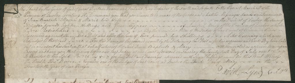 - Procès entre Pierre Robichaud, d'une part, et Jean-Baptiste Moreau, habitant de Cap Saint-Ignace, d'autre part, à propos d'une dette impayée