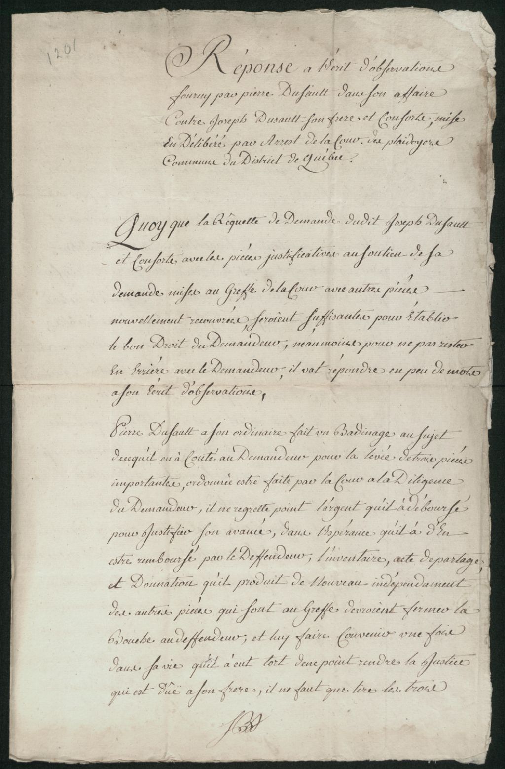 Procès entre Joseph Dusault (Dussault), habitant de la Pointe-de-Lévy, paroisse Saint-Joseph, fils et héritier en partie des défunts Jean-François Dusault (Dussault dit Lafleur) et Madeleine Bourassa, d'une part, et Pierre Dusault (Dussault), aussi habitant de la Pointe-de-Lévy, son frère aîné, d'autre part, à propos de la division, de la gestion et de l'administration des biens meubles et immeubles dépendants des successions de leurs défunts parents
