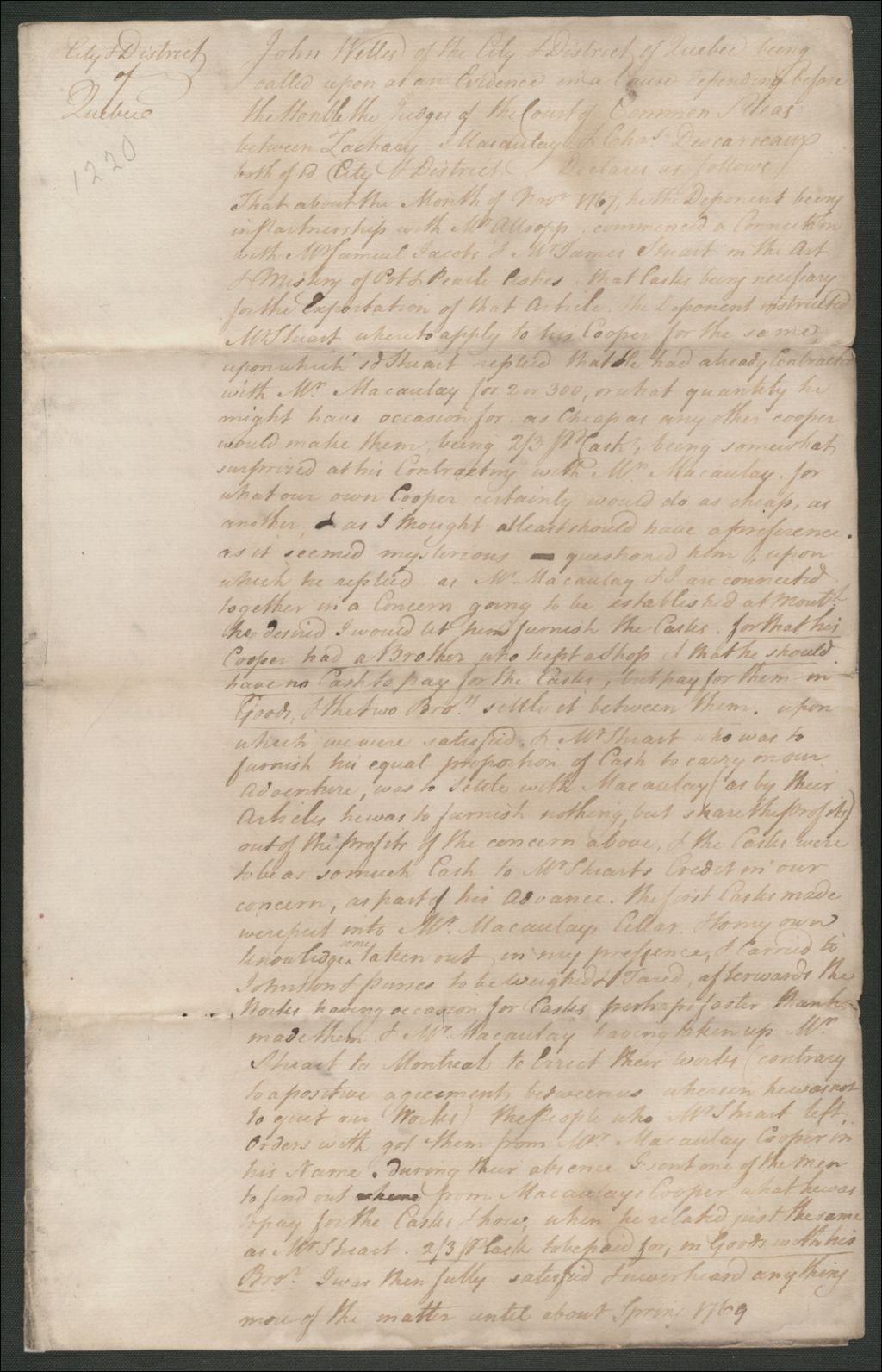- Procès entre Zachary Macaulay, marchand de la ville de Québec, d'une part, et Charles Descarreaux, aussi de la ville de Québec, d'autre part, à propos du règlement des comptes qu'ils ont entre eux