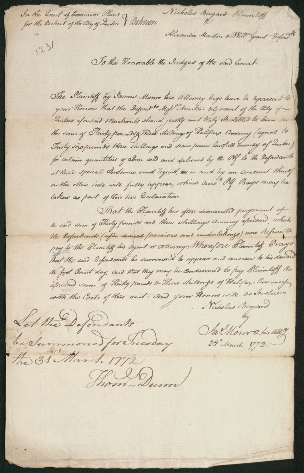 Procès entre Nicholas Bayard, d'une part, et Alexander Martin et William Grant, marchands de la ville de Québec, d'autre part, à propos du paiement d'une somme de 30 livres et 3 shillings en monnaie courante d'Halifax, due par les défendeurs pour une quantité de fer à eux vendus et livrés
