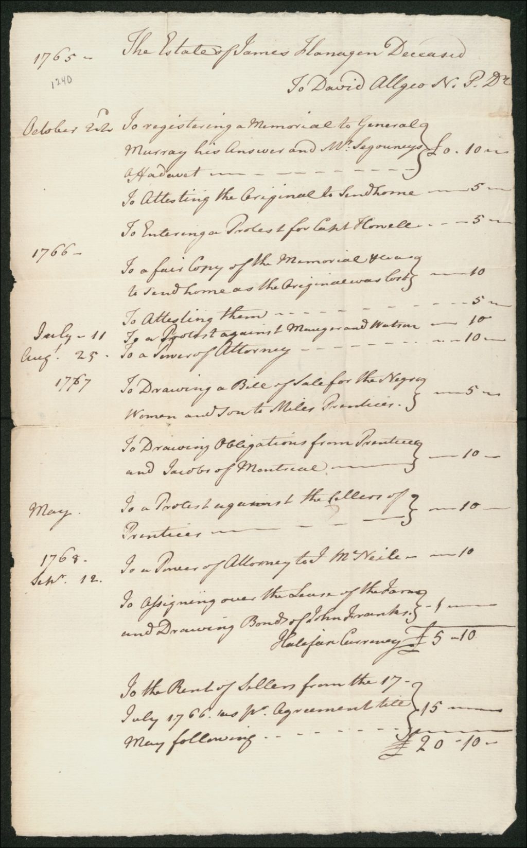 - Ce dossier en matières civiles provient de la Cour des plaidoyers communs. Il comprend une requête des exécuteurs testamentaires de feu James Flanagin (Flanagan) réclamant une somme de 20 livres, 18 shillings et 6 pences en monnaie courante d'Halifax, due au défunt testateur par David Algeo (Allgeo) ; un écrit de défense de David Algeo (Allgeo) ; et des comptes courants entre les parties