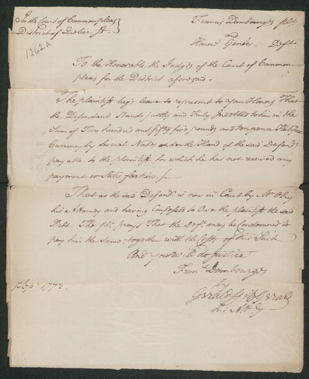 Ce dossier en matières civiles provient de la Cour des plaidoyers communs. Il comprend une requête de Francis Dambourgès, écrit par Gerald Fitzgerald son avocat, réclamant 252 livres et 10 sols, en argent d'Halifax, à Honoré Ginier (Gignier), à propos d'une dette impayée