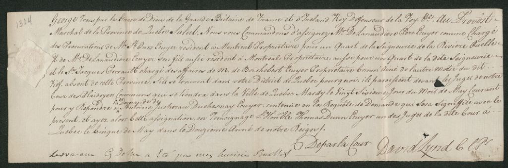 - Procès entre Antoine Juchereau Duchesnay, écuyer et seigneur du fief de Saint-Denis situé entre les fiefs de Kamouraska et de Rivière-Ouelle; d'une part, et Jacques Perreault, l'avocat de la défunte madame Boishébert, propriétaire d'une partie de la seigneurie de la Rivière-Ouelle, et des sieurs Charles De Lanaudière, écuyer et Roch de Saint-Ours, écuyer et chevalier de l'Ordre Royal et militaire de Saint Louis et ancien capitaine au service de France, propriétaires de l'autre partie de ladite seigneurie, avocat investi d'une proclamation pour prendre en mesure tous les décisions sur le litige, d'autre part, à propos du paiement des rentes par les paysans situés sur un terrain appartenant au sieur Duchesnay suivant le tracé d'un ligne de séparation de seigneuries, paysans qui autrefois étaient dans la seigneurie de madame Boishébert