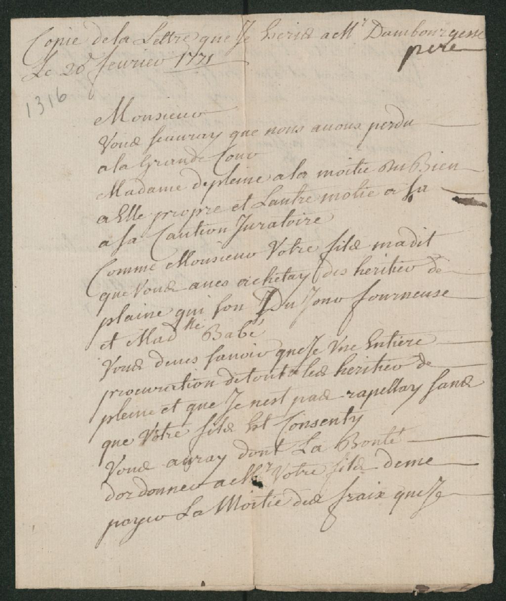 Procès entre Étienne Trottier Desaunier (Desaulniers) Beaubien, d'une part et Jean-Baptiste Dambourgès, d'autre part, pour un montant correspondant à la rente non payé sur la maison que le sieur Beaubien a eu en héritage, 20 février 1771 au 17 mars 1772, Archives nationales à Québec, Fonds Cour des plaidoyers communs du district de Québec, (03Q,TL24,S1,D1316).