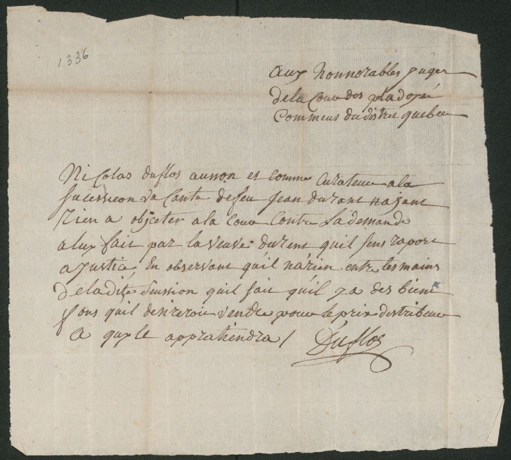 - Procès entre Marie-Anne Boissel, veuve de feu sieur Jean Durand, d'une part, et Nicolas Duflos (Duflau) au nom et comme curateur à la succession vacante de Jean Durand, à propos d'une somme qui lui est due pour ses droits matrimoniaux et pour son contrat de mariage