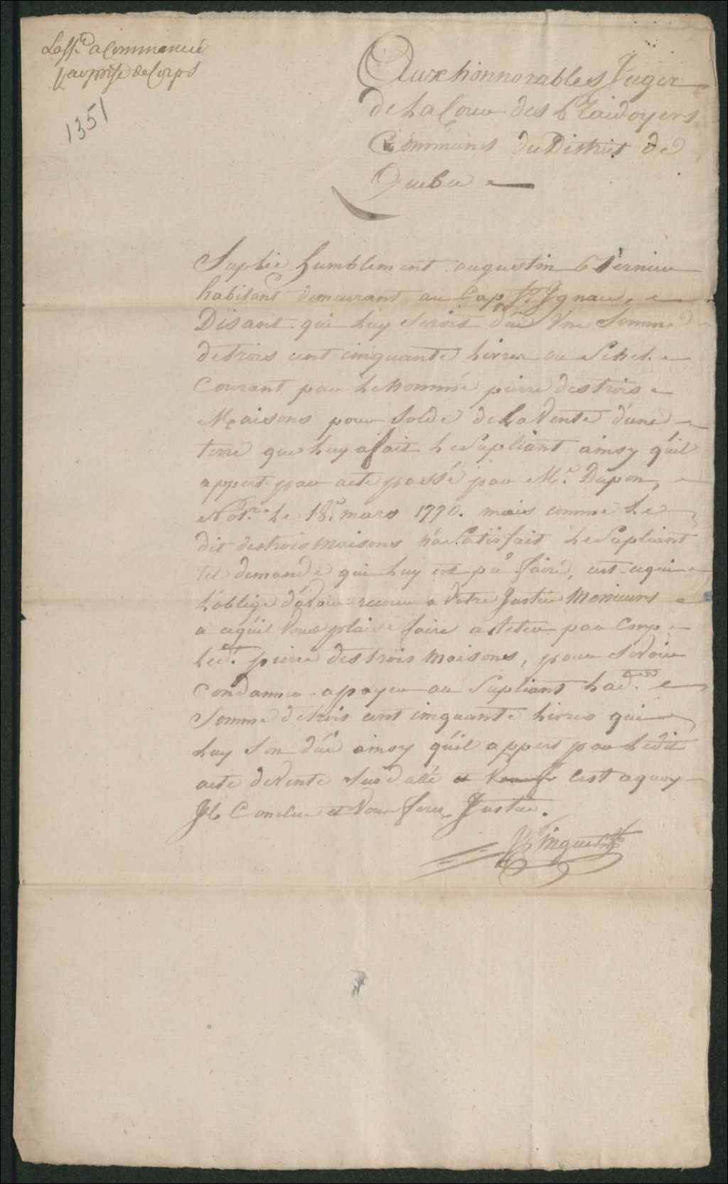 - Ce dossier en matières civiles provient de la Cour des plaidoyers communs. Il comprend une requête de la part d'Augustin Bernier réclamant une somme de 350 livres ou shillings courants à Pierre Destroismaisons pour le solde de la vente d'une terre; acte de vente notarié concernant la terre en question