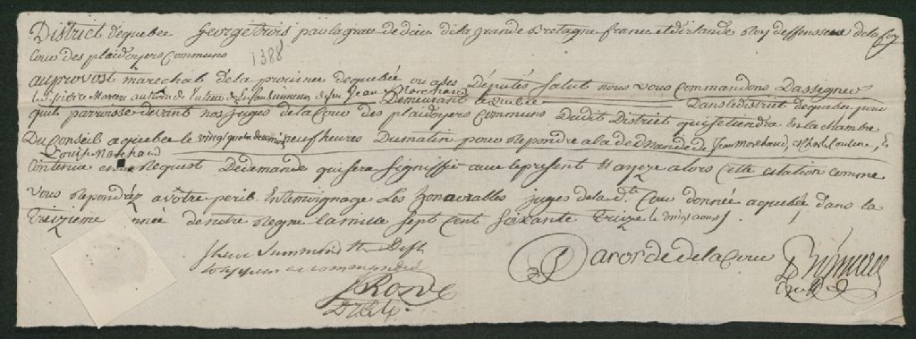 Procès entre Jean Marchand, voyageur, Charles Couture habitant de la Pointe de Lévy au nom et comme ayant épouse Marie-Geneviève Marchand, Louise Marchand, fille majeure, d'une part, et Pierre Marcoux, en nom et comme tuteur d'Élizabeth Marchand, d'autre part, à propos d'une licitation sur les possessions de feu Jean Marchand et dame Godbout, 20 août 1773, Archives nationales à Québec, Fonds Cour des plaidoyers communs du district de Québec, (03Q,TL24,S1,D1388).