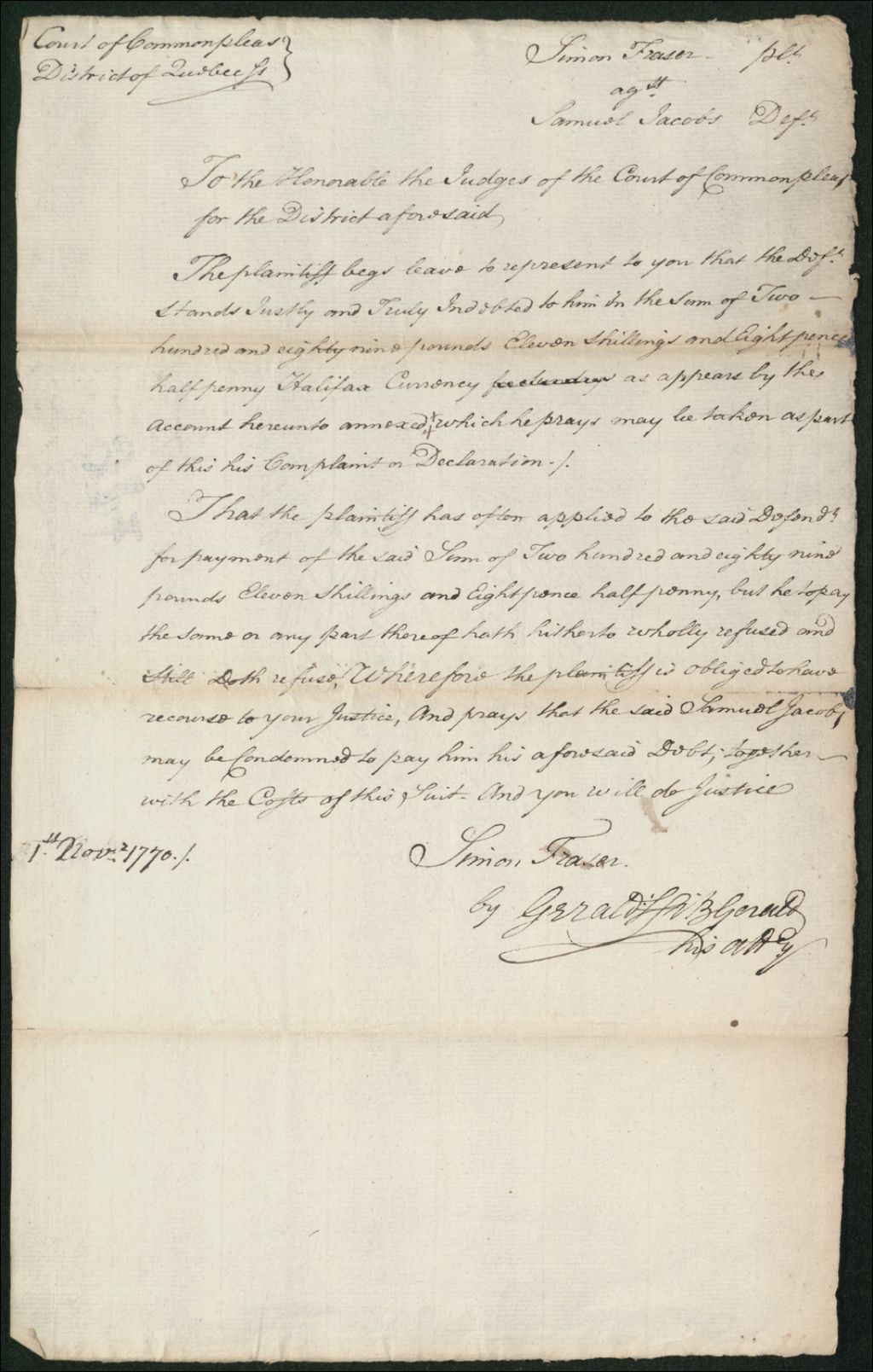 - Ce dossier en matières civiles provient de la Cour des plaidoyers communs. Il contient une requête faite par Gerald Fitzgerald, avocat de Simon Fraser réclamant la somme de 89 livres, 11 shillings et 8 sols et demi, en argent courant d'Halifax, à Samuel Jacobs