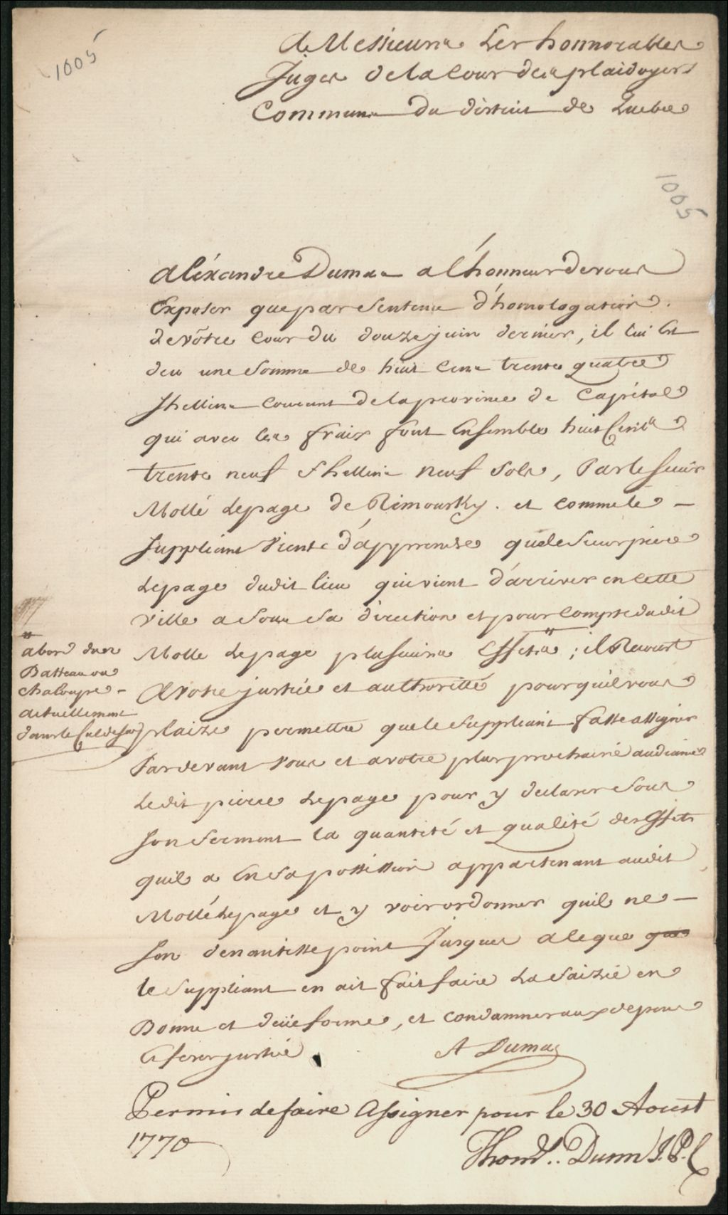 Litige entre Alexandre Dumas, négiociant en cette ville d'une part, et Pierre Mollé (Molet) Lepage, de Rimouski, d'autre part, à propos d'une somme de 834 shillings, en argent courant de la province de la Capitale, 8 mai 1769 - 4 septembre 1770, Archives nationales à Québec, Fonds Cour des plaidoyers communs du district de Québec, (03Q,TL24,S1,D1005).