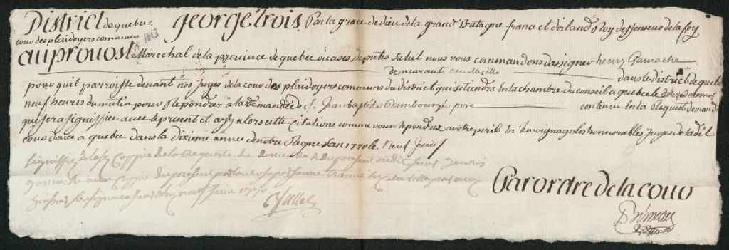 - Ce dossier en matières civiles provient de la Cour des plaidoyers communs. Il contient une requête faite par l'avocat Pinguet, pour Jean-Bapthiste Dambourges, réclamant une somme de 243 shillings et 12 sols en argent courant, à Henry Gamache, deux mandats d'assignations contre Henry Gamache, ainsi que deux exploits d'assignations en conséquence