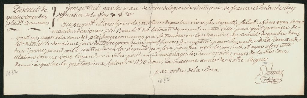 - Ce dossier en matières civiles provient de la Cour des plaidoyers communs. Il contient une requête de Pierre Parent, prêtre du diocèse de Québec, réclamant une somme de 25 livres en argent courant d'Halifax, à J.B. Bouchette (Bouchet) dit Latourte, et un mandat d'assignation contre J.B. Bouchette (Bouchet) dit Latourte