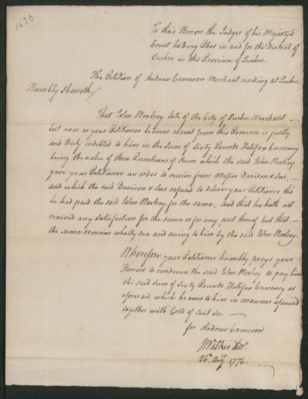 Cause impliquant Andrew Cameron et John Woolsey, 1776, Archives nationales à Québec, Fonds Cour des plaidoyers communs du district de Québec, (03Q,TL24,S1,D1620).
