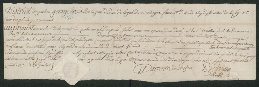 - Ce dossier en matières civiles provient de la Cour des plaidoyers communs. Il comprend une requête de Charles Girard, réclamant à Charles Couillard, une somme de 600 shillings, à propos de la banalité des moulins de la seigneurie; un témoignage du sieur La Croix (Lacroix); deux mandats d'assignation du sieur Couillard; le contrat du partage de la seigneurie de Beaumont datant du 30 octobre 1728; un témoignage du sieur Louis Bergeron pour le procès; deux défenses du sieur Couillard; une réplique de Charles Girard; un jugement de la cour condamant le sieur Couillard aux dépens