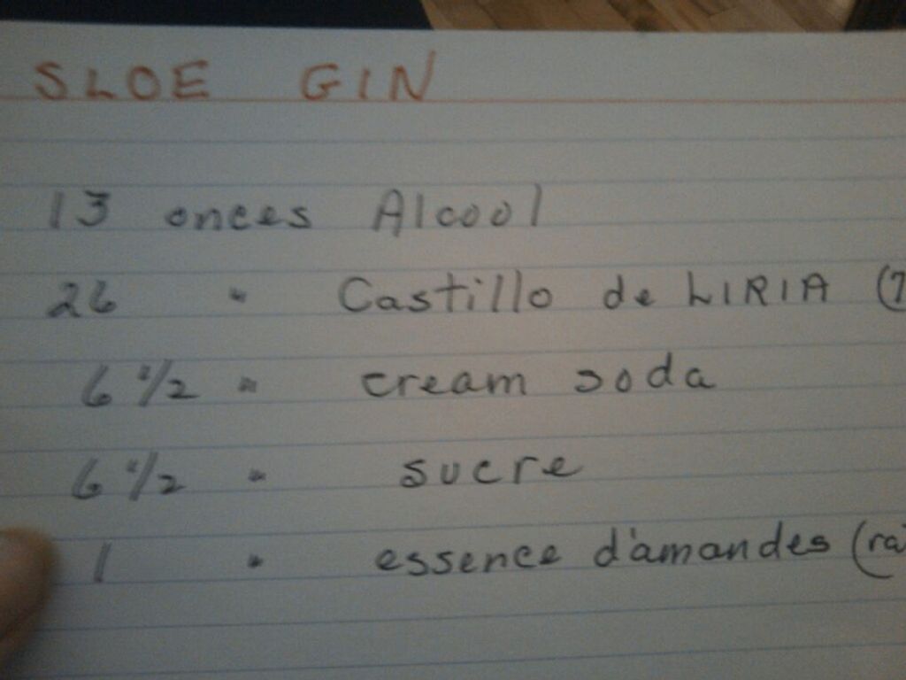 Ce souvenir a été partagé par Ghislaine Saillant de Montréal : « C'est une recette de Sloe Gin qui se faisait au début du siècle dernier. C'était la recette de Monsieur Walter Lefebvre, né en 1884 et décédé en 1938. Ce qu'on ne voit pas sur la photo, dont on voit la première syllabe, est le mot ratafia, mais cette fiche était dans les recettes de sa fille. Elle mettait de l'essence d'amande, car le ratafia est tellement difficile à trouver. Mais si vous avez du ratafia, ce sera le bonheur ! »