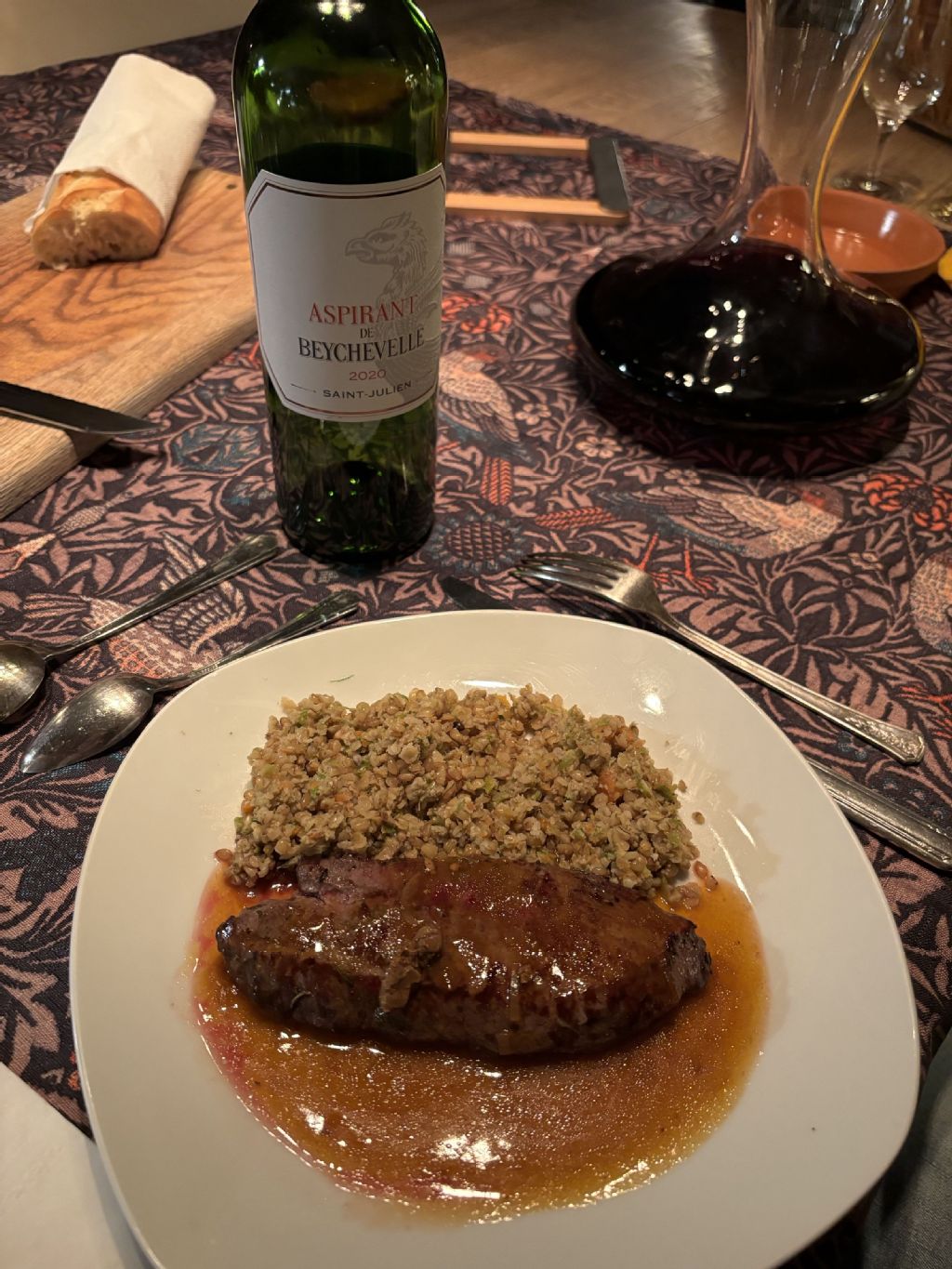Filet d’autruche, sauce au foie gras et porto, et boulgour à la duxelles de champignons