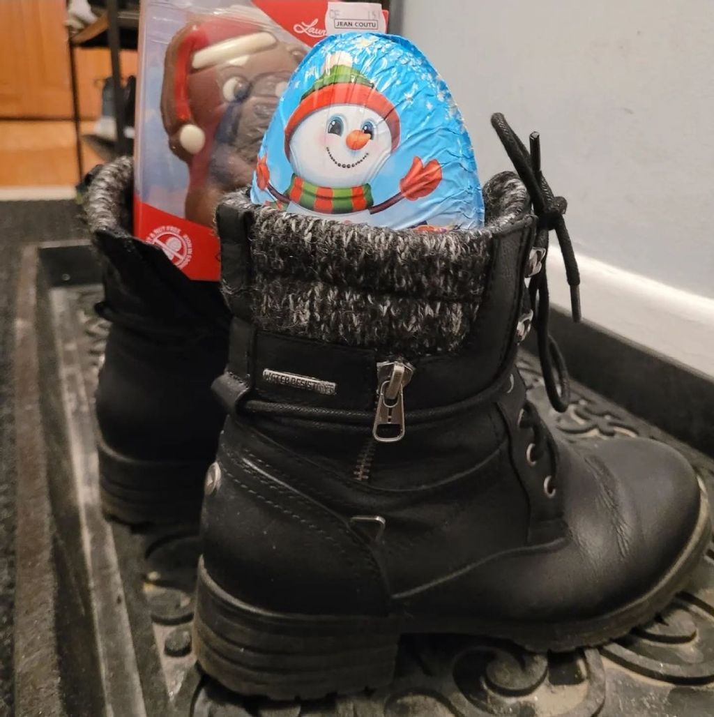 Ce souvenir a été partagé par Eliza Mulstein de Laval : « Photo de bottines dans lesquelles se trouvent un gros oeuf en chocolat ainsi qu'un lapin en chocolat dans l'autre. Mes parents ont grandi en Roumanie communiste et l'une des traditions du temps des fêtes qu'ils ont tenu à faire passer, c'est le mythe autour de Saint-Nicolas. Tous les 6 décembre, chacun de nous recevons des petites gâteries dans nos bottes : chocolat, petits jouets... de quoi nous remonter. Sous le communisme, mes parents recevaient généralement des produits plus difficiles à obtenir pendant le reste de l'année : ma mère me disait qu'elle recevait par exemple des mandarines de la part de Saint-Nicolas. Les enfants moins sages reçoivent quant à eux des bâtonnets dans leurs bottes, mais heureusement, ça ne m'est jamais arrivé. C'est une bonne surprise pour démarrer la période des fêtes à chaque année ! »