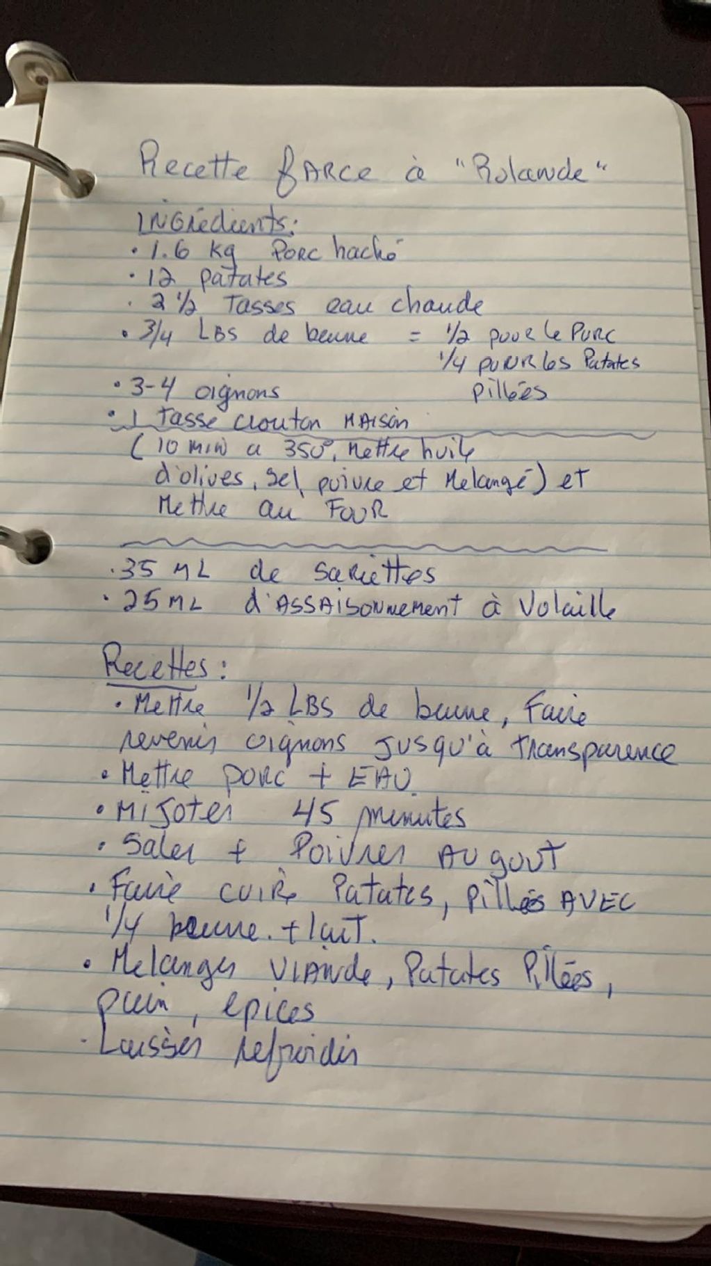 Recette de farce à Rolande, 2023, Archives nationales à Montréal, Collection En direct de nos mémoires, (06M,P10031,D1,P110), Photographe non identifié.