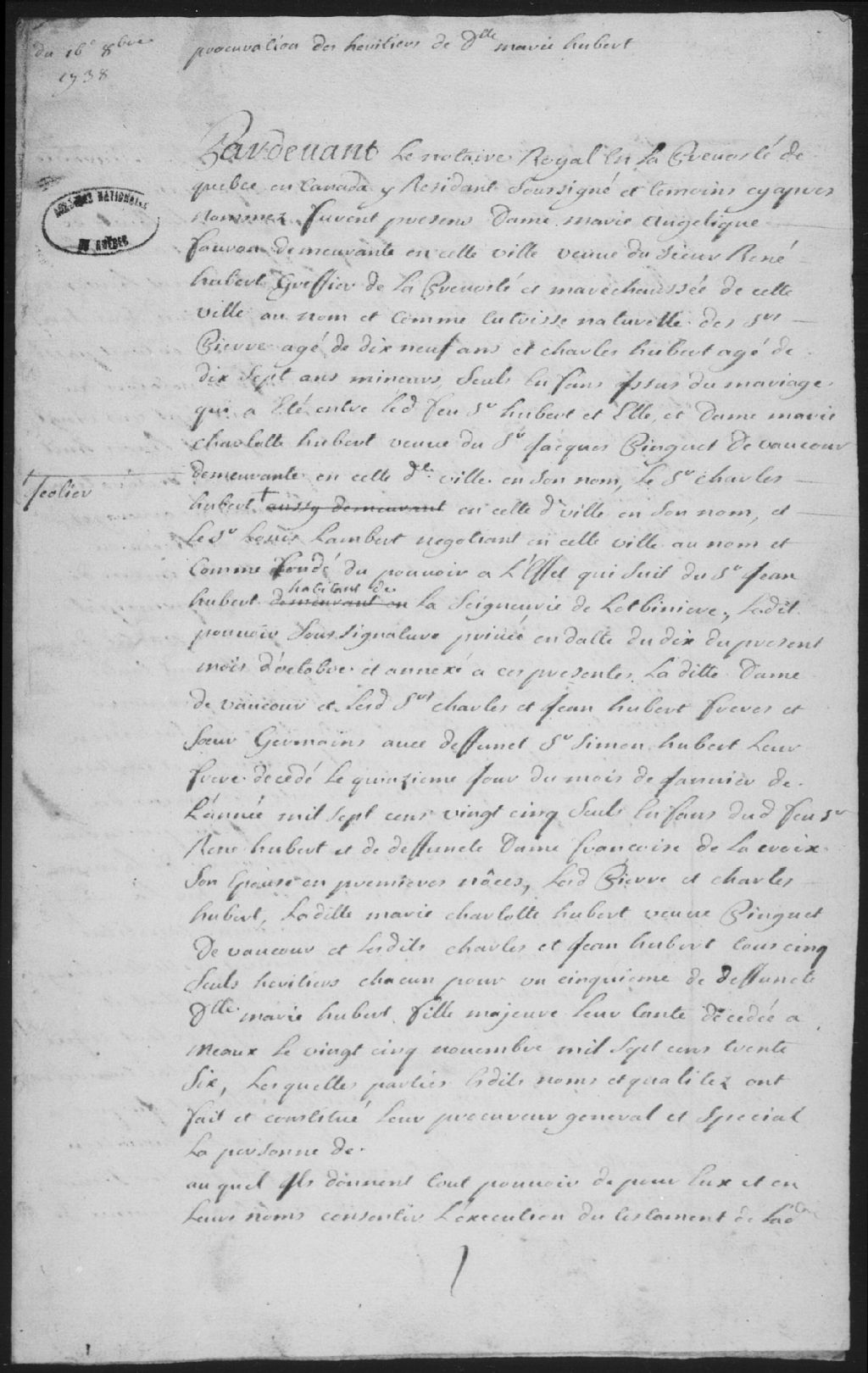 Jacques-Nicolas Pinguet de Vaucour, 1726-1748, Archives nationales à Québec, Fonds Cour supérieure. District judiciaire de Québec. Greffes de notaires, (03Q,CN301,S223).