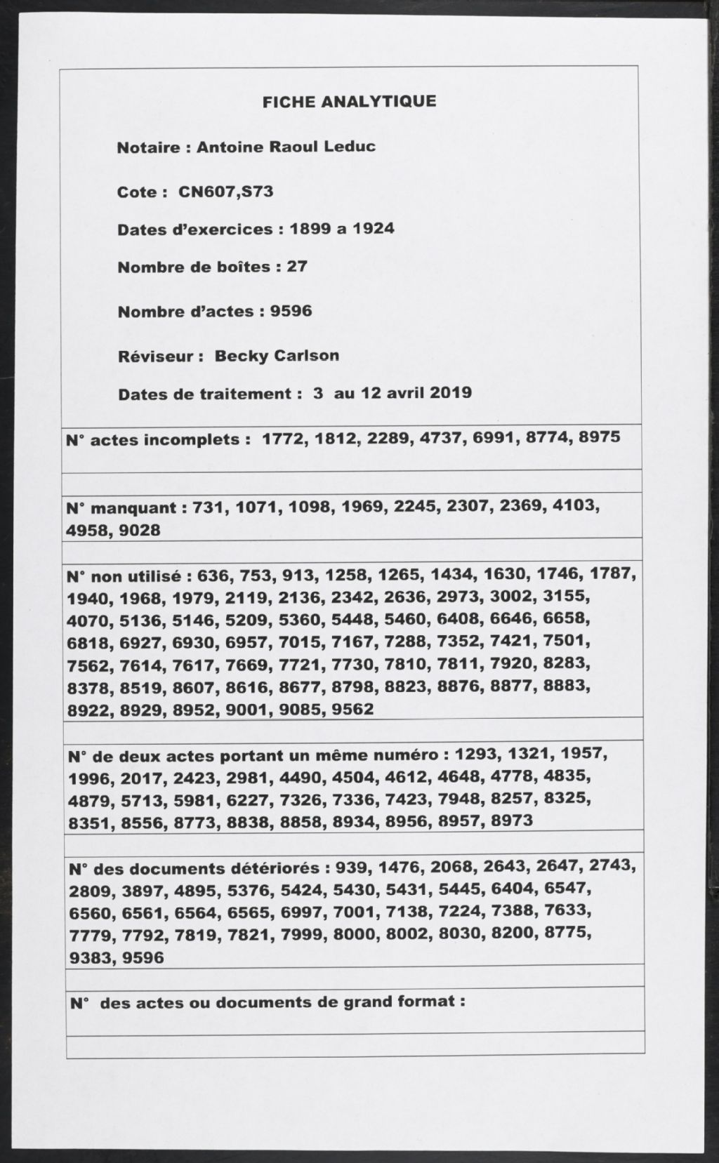 Antoine Raoul Leduc, 1899-1924, Archives nationales à Montréal, Fonds Cour supérieure. District judiciaire de Beauharnois. Greffes de notaires, (06M,CN607,S73).