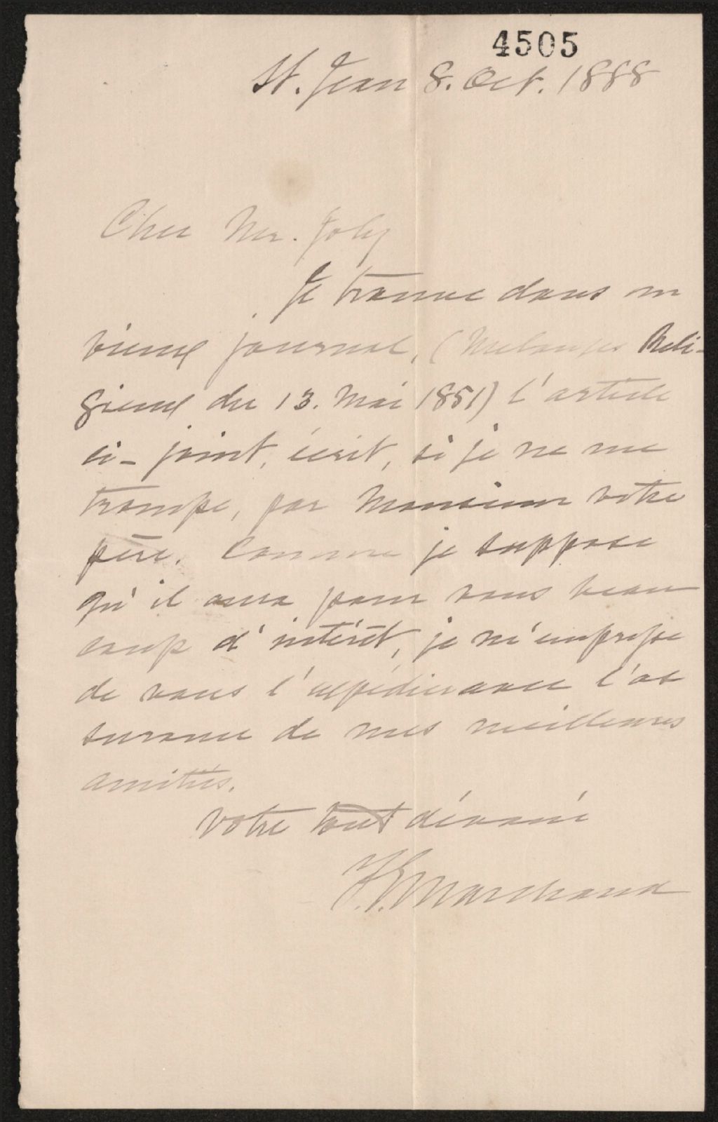 Lettre de F. G. Marchand à Henri-Gustave Joly, 8 octobre 1888, Archives nationales à Québec, Fonds Famille Joly de Lotbinière, (03Q,P351,S4,SS1,P4505).