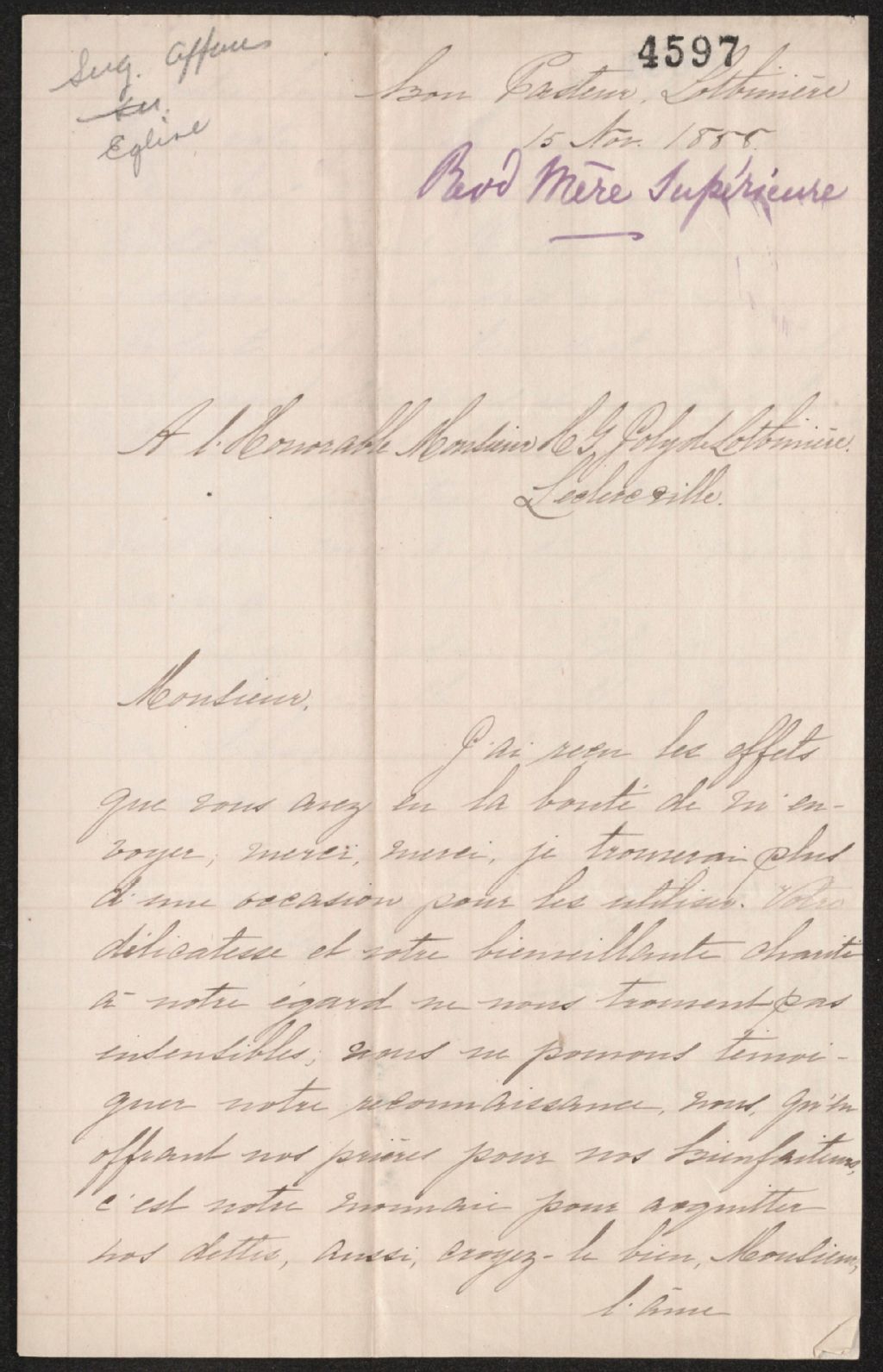 - Remercie pour les effets qu'il a eu la bonté d'envoyer. Elle trouvera plus d'une occasion pour les utiliser. Ne peut témoigner autrement sa reconnaissance qu'en offrant des prières. Est très satisfaite du bois qu'il a envoyé