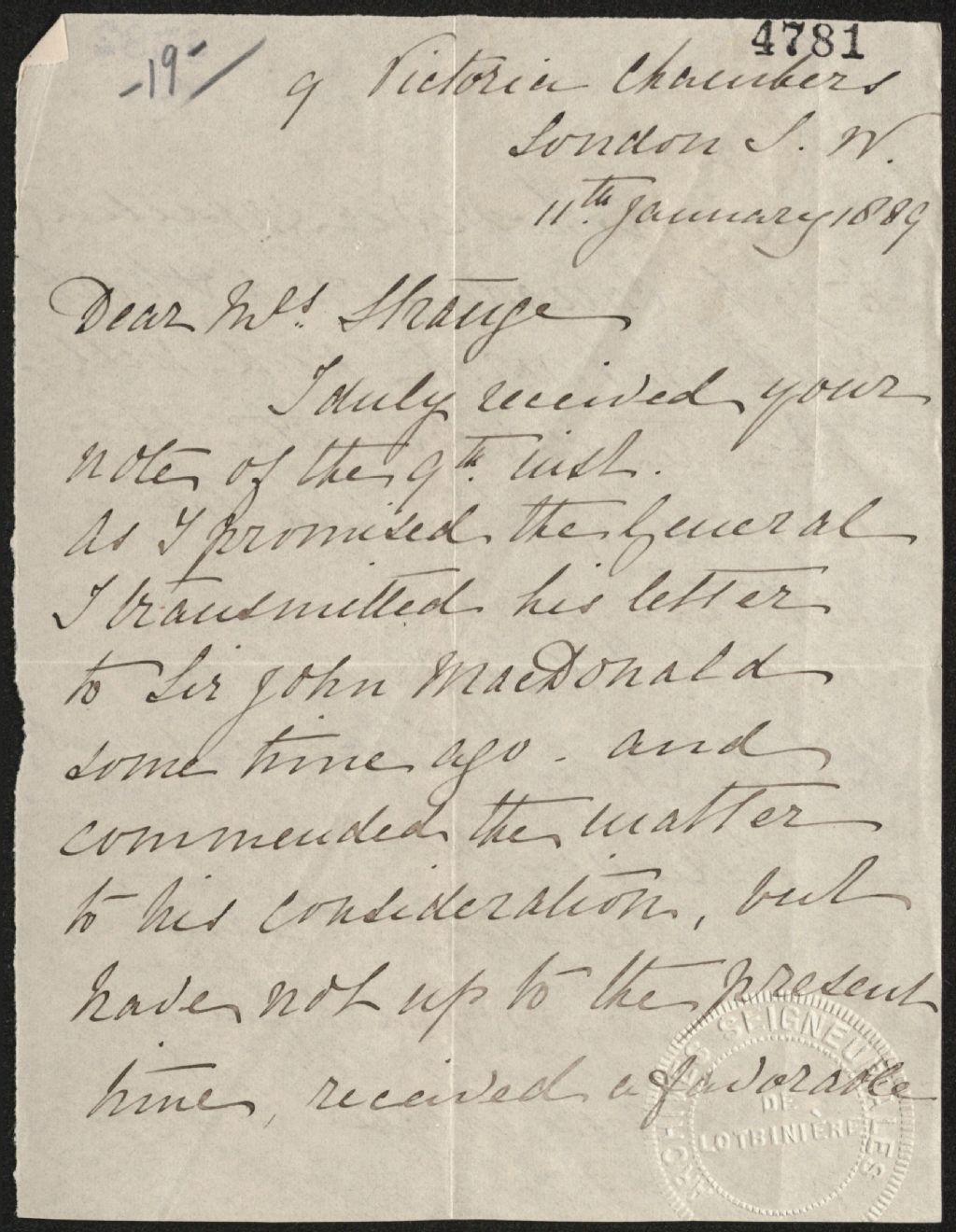 Copie de lettre de Charles Tupper à Madame T. B. Strange, 11 janvier 1889, Archives nationales à Québec, Fonds Famille Joly de Lotbinière, (03Q,P351,S4,SS1,P4781).