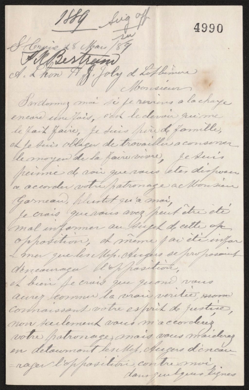 Lettre de François-Xavier Bertrand à Henri-Gustave Joly