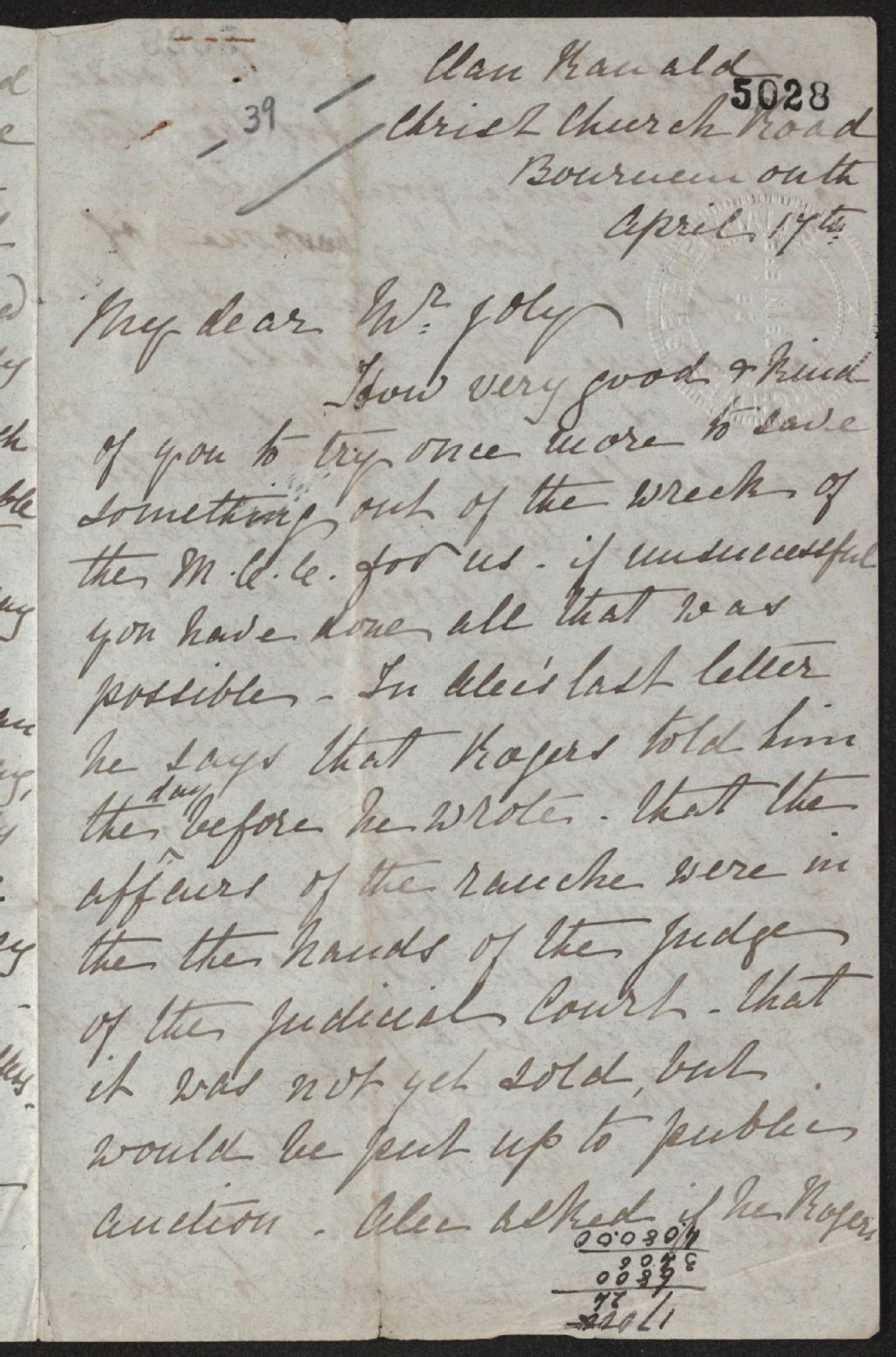 Lettre d'Elinor Bland Strange à Henri-Gustave Joly, 17 avril 1889, Archives nationales à Québec, Fonds Famille Joly de Lotbinière, (03Q,P351,S4,SS1,P5028).