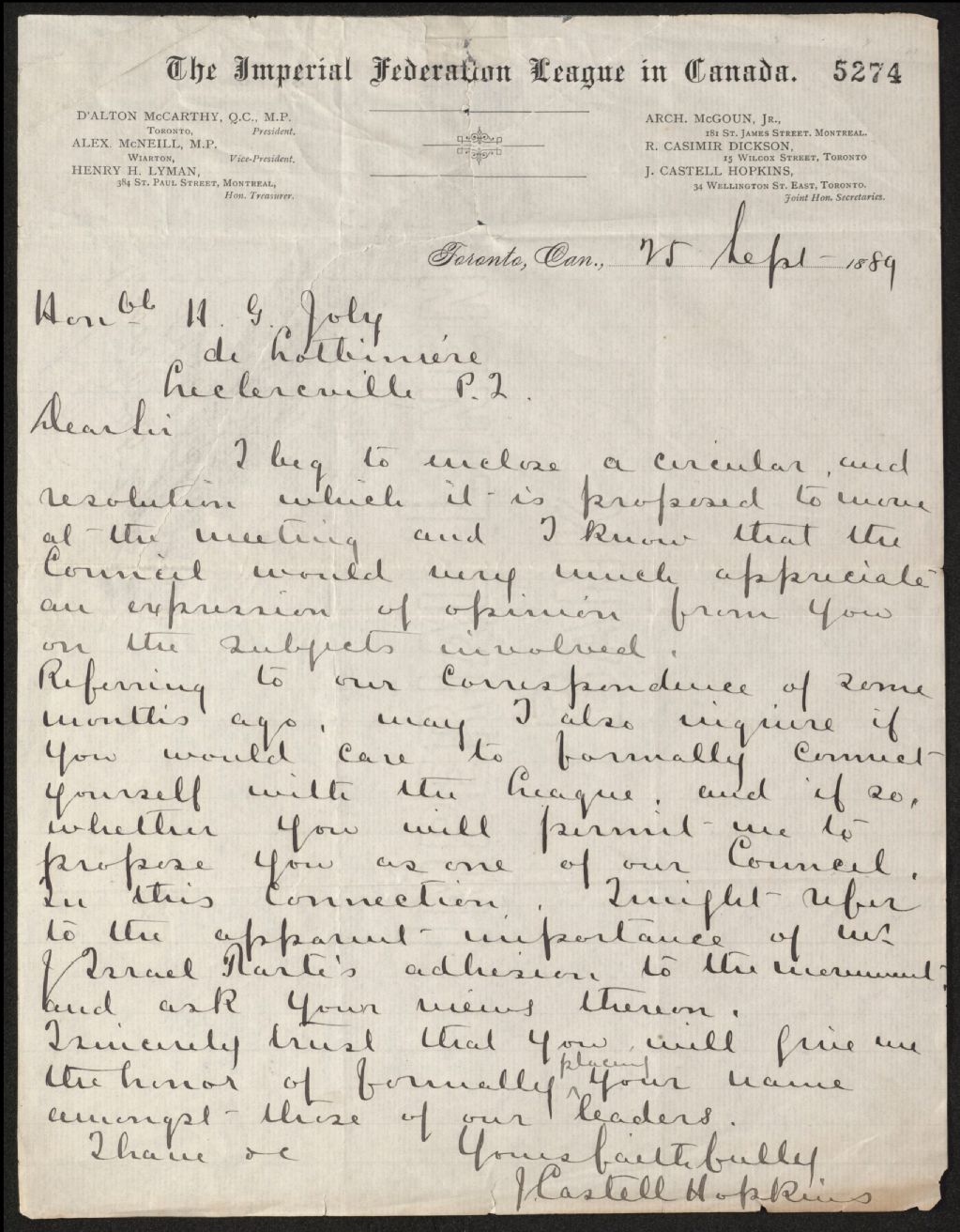 Lettre de J. Castell Hopkins à Henri-Gustave Joly