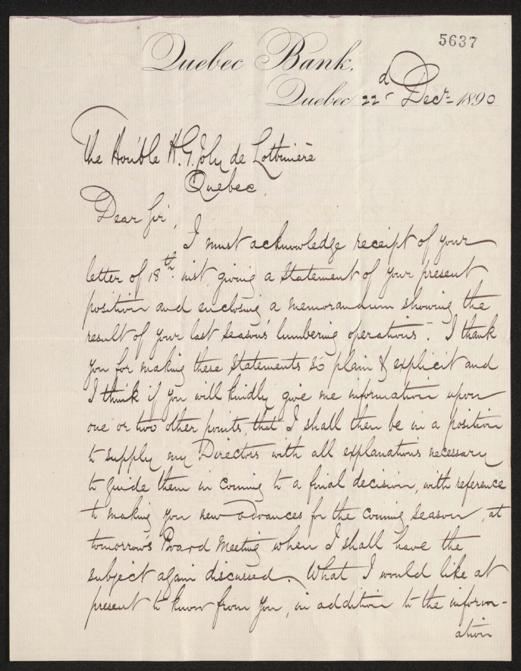 Lettre de James Stevenson à Henri-Gustave Joly, 22 décembre 1890, Archives nationales à Québec, Fonds Famille Joly de Lotbinière, (03Q,P351,S4,SS1,P5637).