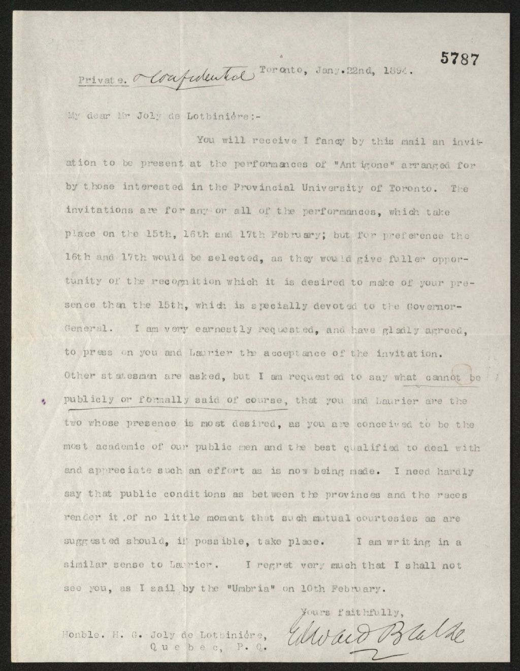 Lettre d'Edward Blake à Henri-Gustave Joly, 22 janvier 1894, Archives nationales à Québec, Fonds Famille Joly de Lotbinière, (03Q,P351,S4,SS1,P5787).