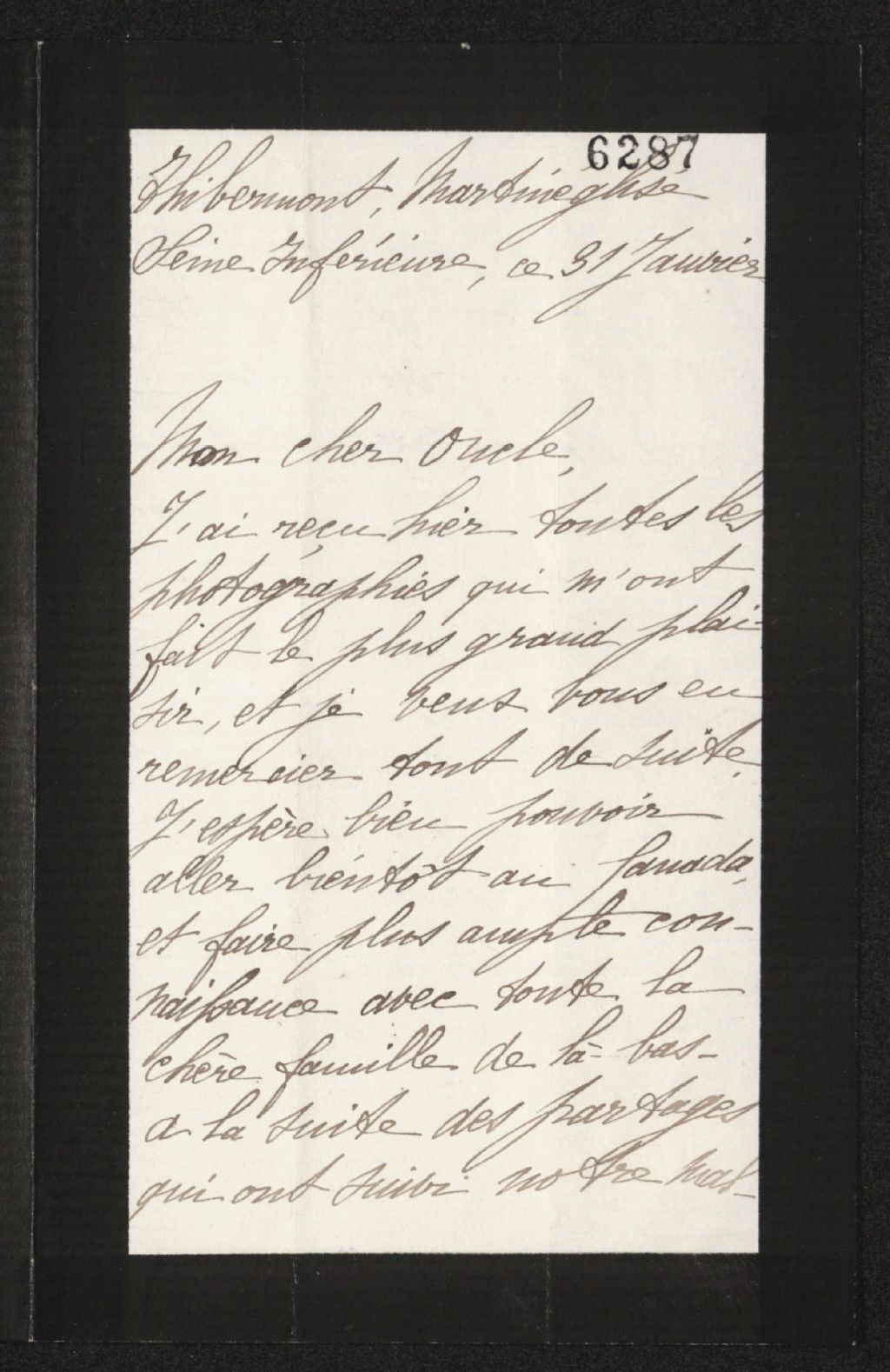 A reçu toutes les photographies. Espère aller bientôt au Canada et faire connaissance avec la famille là-bas. A reçu en héritage le château de Thibermont. Les conséquences de cet héritage. Nouvelles de la famille