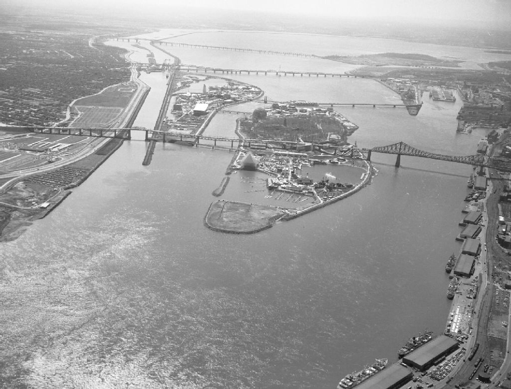 Vue aérienne du site de l'exposition universelle de 1967 et du pont Jacques-Cartier
