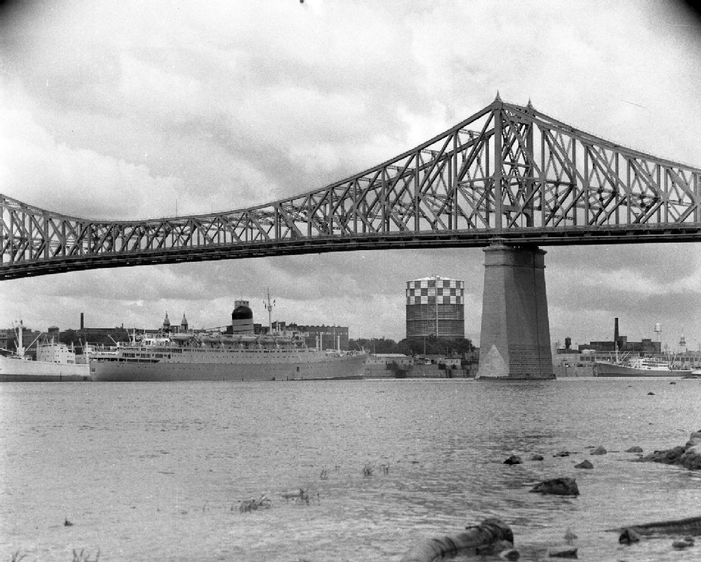 Vue panoramique de Montréal, du pont Jacques-Cartier et des navires transatlantiques, 29 juillet 1965, Archives nationales à Montréal, Fonds Armour Landry, (06M,P97,S1,D8284-8284), Armour Landry.
