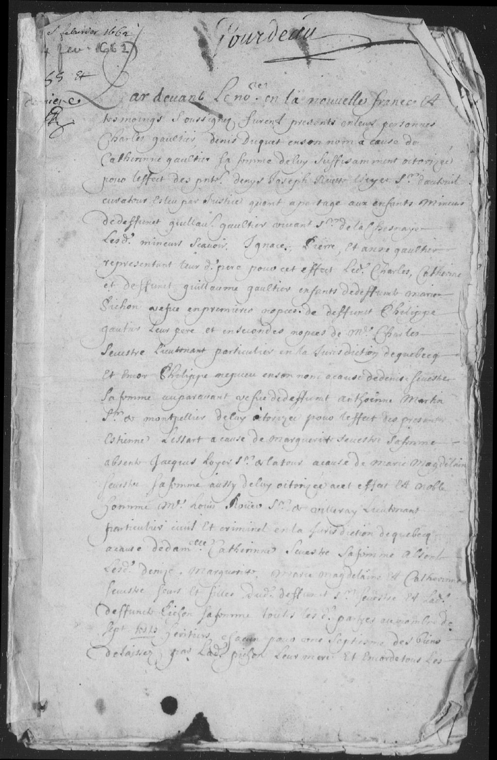 - Dans l'un des actes du greffe de Audouart dit Saint-Germain (CN301, S6), il est dit que Gourdeau est seigneur de Beaulieu à l'île d'Orléans. Les actes consultés ne nous informent pas du lieu de résidence ou de pratique, mais ont été passés à Québec. Puisqu'il périt dans sa maison à l'île d'Orléans lors d'un incendie, il est à croire que son lieu de résidence était l'île d'Orléans (4 février 1662-15 mai 1663)