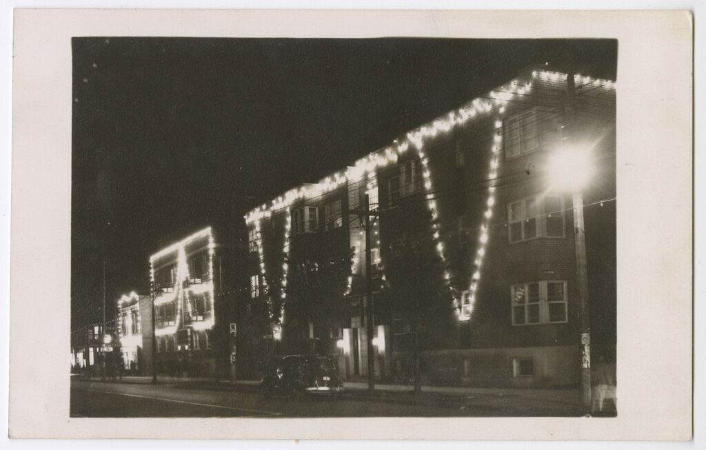 [Immeubles la nuit, décorés de guirlandes lumineuses]