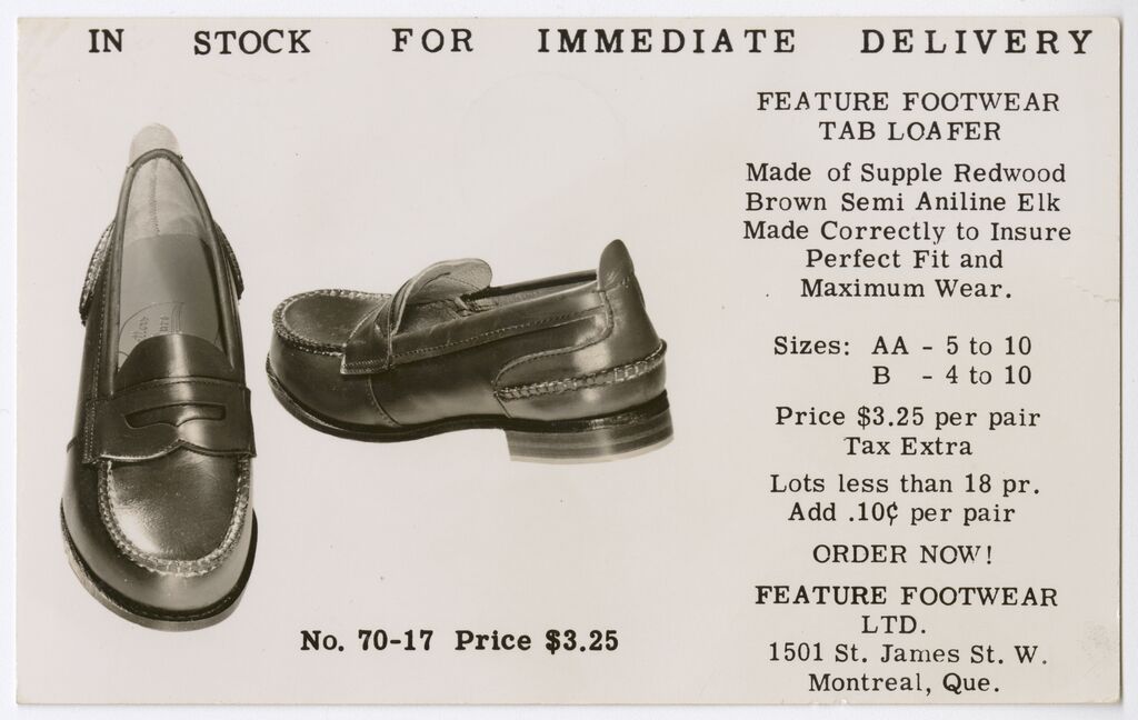 In stock for immediate delivery : Feature Footwear tab loafer, made of supple redwood brown semi aniline elk ... Feature Footwear Ltd., 1501 St. James St. W. Montreal, Que. /