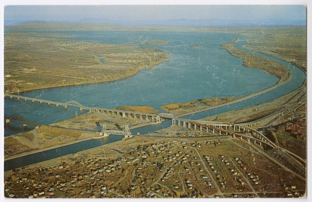 Vue aérienne du pont Mercier montrant la voie maritime du St-Laurent vers le lac St-Louis = Aerial view of Mercier Bridge and the seaway /