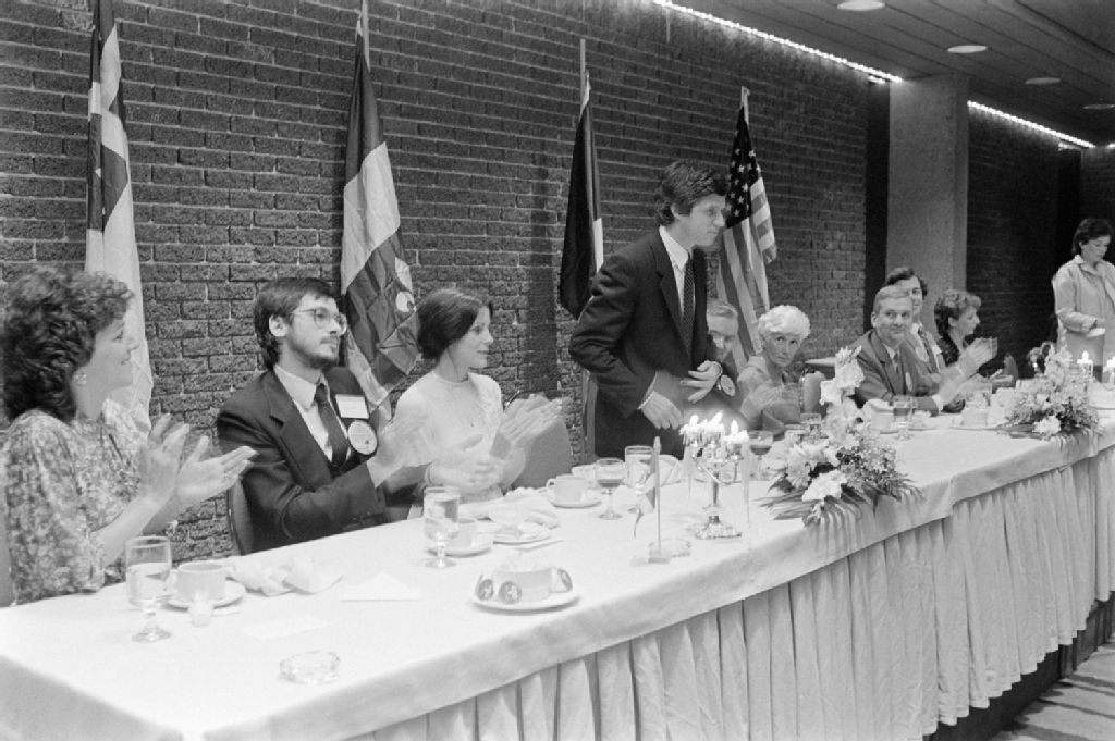 - L'épouse de Jean-Jacques Bertrand, ex-Premier Ministre du Québec, remet les mémoires de son mari lors du congrès des archivistes à l'Auberge des Gouverneurs