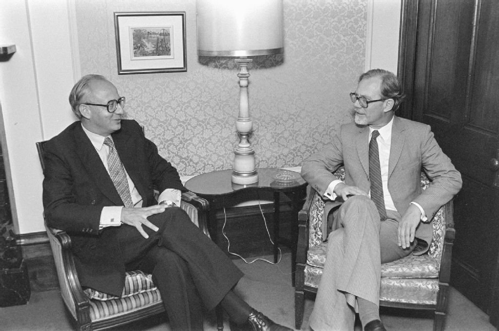 Rencontre entre Jean-François Morin, Ministre des Affaires Intergouvernementales et M. Spitaels, président du parti socialiste de Belgique, 1983-08-19, Archives nationales à Québec, Fonds Ministère des Communications, (03Q,E10,S44,SS1,D83-388), Daniel Lessard.