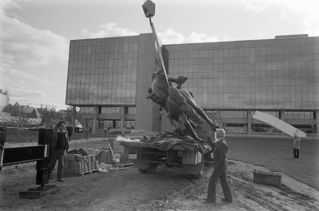 Erection de la statue équestre de Simon Bolivar sur la Place de la Justice à Québec, 1983-10-19, Archives nationales à Québec, Fonds Ministère des Communications, (03Q,E10,S44,SS1,D83-565), Denis Chalifour.